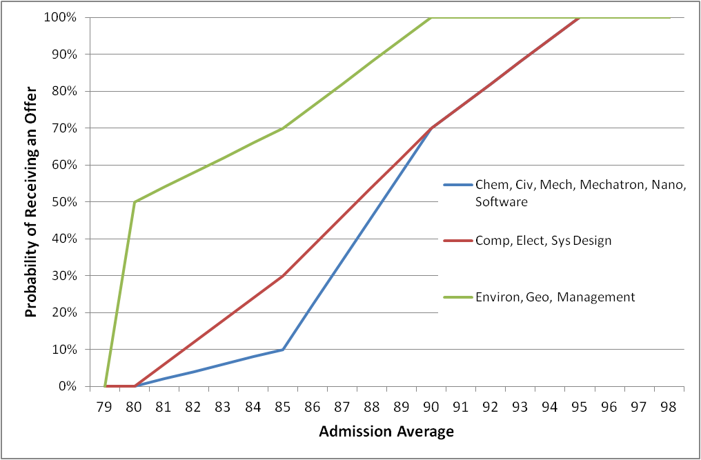 In the brochure for Waterloo Engineering, there is a table showing your chances at an offer, reproduced below: