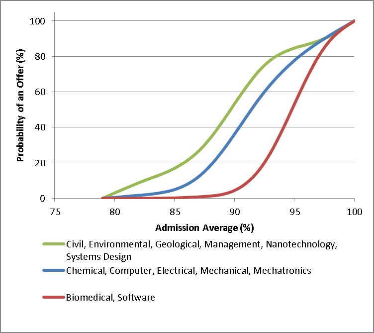 The 2016 Admissions brochures for Engineering and other programs have recently been uploaded. We have continued to include a table showing admission probabilities (“chances”) for different programs and grade ranges. It seems that many people find it useful for getting a realistic impression of their chances at admission, so that they can plan accordingly. The online version of this table can be found here. This is based on the 2015 results and as usual we caution that 2016 may be different, since it all depends on the competition level (which is unknown in advance). In 2015 the level of competition continued to increase, but maybe it will go down in 2016, since we know that’s the general direction of the demographics in Ontario.For convenience and readability, we lump the grades into ranges in this table. Some people find the big jumps in probability between the different grade ranges to be difficult to interpret, so I have been generating graphs that provide interpolations between the various grades in finer detail. As usual, the grades shown here are the raw, unadjusted averages of the Grade 12 required courses (or equivalents), not including any other factors such as scores for extracurriculars (the AIF).