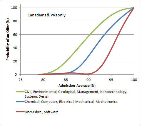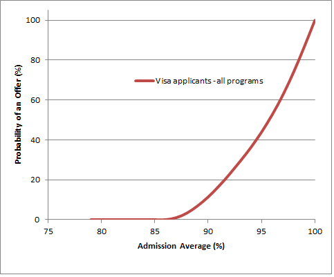 One difference this year: I’m going to break the chances data up into two categories, “Visa” (or study permit) applicants, and “Canadians and Permanent Residents” applicants. The tables mentioned above lump everyone together, but looking back at the last year or two it seems like it may be too pessimistic for Canadians and overly-optimistic for Visa applicants, as we’ll see below.For convenience and readability, we lump the grades into ranges in this table. Some people find the big jumps in probability between the different grade ranges to be difficult to understand or interpret, so for several years I have been generating graphs that provide interpolations between the various grades in finer detail (see the end of the post for methodology, if interested). As usual, the grades shown here are the raw, unadjusted averages of the Grade 12 required courses (or equivalents), not including any other factors such as scores for extracurriculars, work experience, or awards.