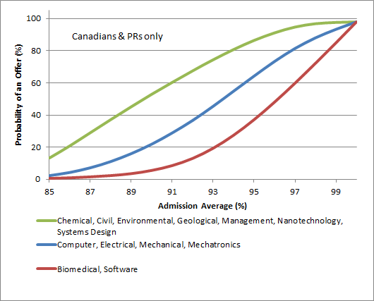 The various programs were chosen to be lumped together because their chances are very similar, so using a different line for each program is not useful. All the interpolated lines look pretty good, with no odd bends or dips. For this year I started the graph at 85%, since this is our nominal minimum required average. “Admission Average” is the average of the required courses (maths, physics, chemistry, English), which depend on the school system and details can be found online.