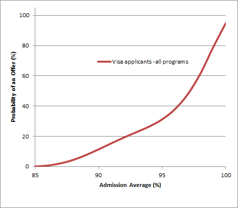 For convenience and readability in a table, we lump the grades into ranges. Some people find the big jumps in probability between the different grade ranges to be difficult to understand or interpret, so I have been generating graphs that provide interpolations between the various grades in finer detail (see the end of the post for methodology, if interested). As usual, the grades shown below are the raw, unadjusted averages of the Grade 12 required courses (or equivalents), not including any other factors such as scores for extracurriculars, work experience, or awards.