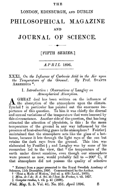 First page of Arrhenius’ paper on the climate effects of changing carbon dioxide concentrations. “Carbonic acid” is an older or alternate name for carbon dioxide in the presence of water.