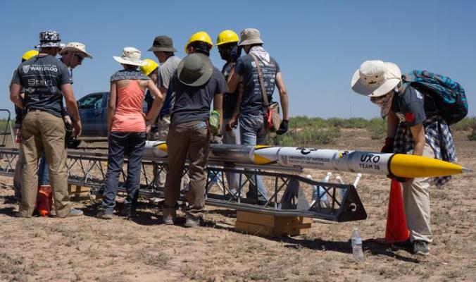 A student design team from Waterloo Engineering recently took first place in its class for the second year in a row at an international rocketry competition in New Mexico. Waterloo Rocketry, which is comprised primarily of engineering undergraduates, successfully launched its new rocket, Unexploded Ordnance (UXO), to an altitude of 13,412 feet to top 14 teams in the hybrid and liquid rocket category.