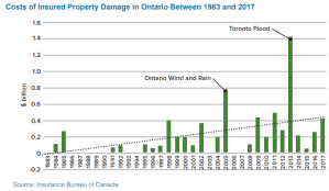Impact Assessment: (page 19). The plan calls for more study of climate change impacts to help with adaptation and mitigation. There is some information on preventing basement flooding, which is certainly a good idea to implement given the more frequent intense rainstorms. This is all good stuff, but I’m not sure how new it is. Presumably people/cities have already been starting to do this? It’s good that there is some recognition that extreme weather is already costing us more in insurance, as seen in the graph.