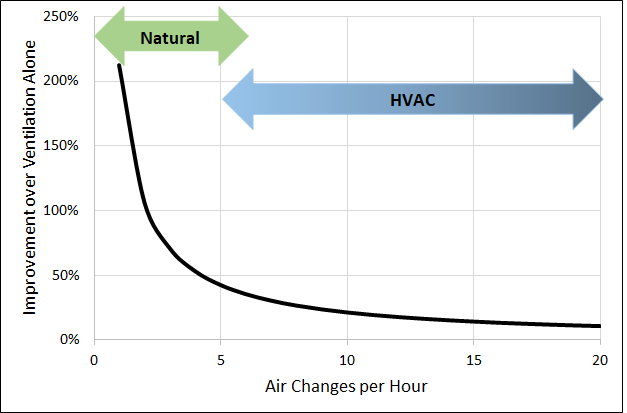 Looking at the chart, we can see that using the HEPA air cleaners potentially improves the air quality by 100% to over 200%, in situations where the ACH is low. I’ve labelled this “Natural” in the chart because this is the typical situation where there is no HVAC and we’re relying on windows (natural ventilation).